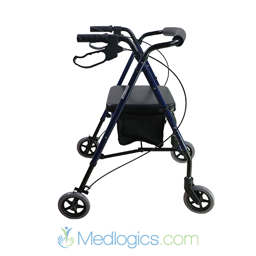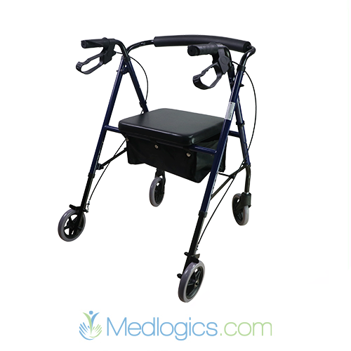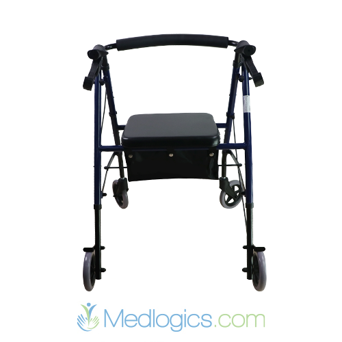 Le rollator est équipé de quatre roues, d'un siège rembourré et d'un sac de rangement situé sous le siège. Il dispose également de poignées ergonomiques avec freins pour une sécurité et une stabilité accrues. Son design léger et pliable le rend pratique pour la mobilité et le rangement.